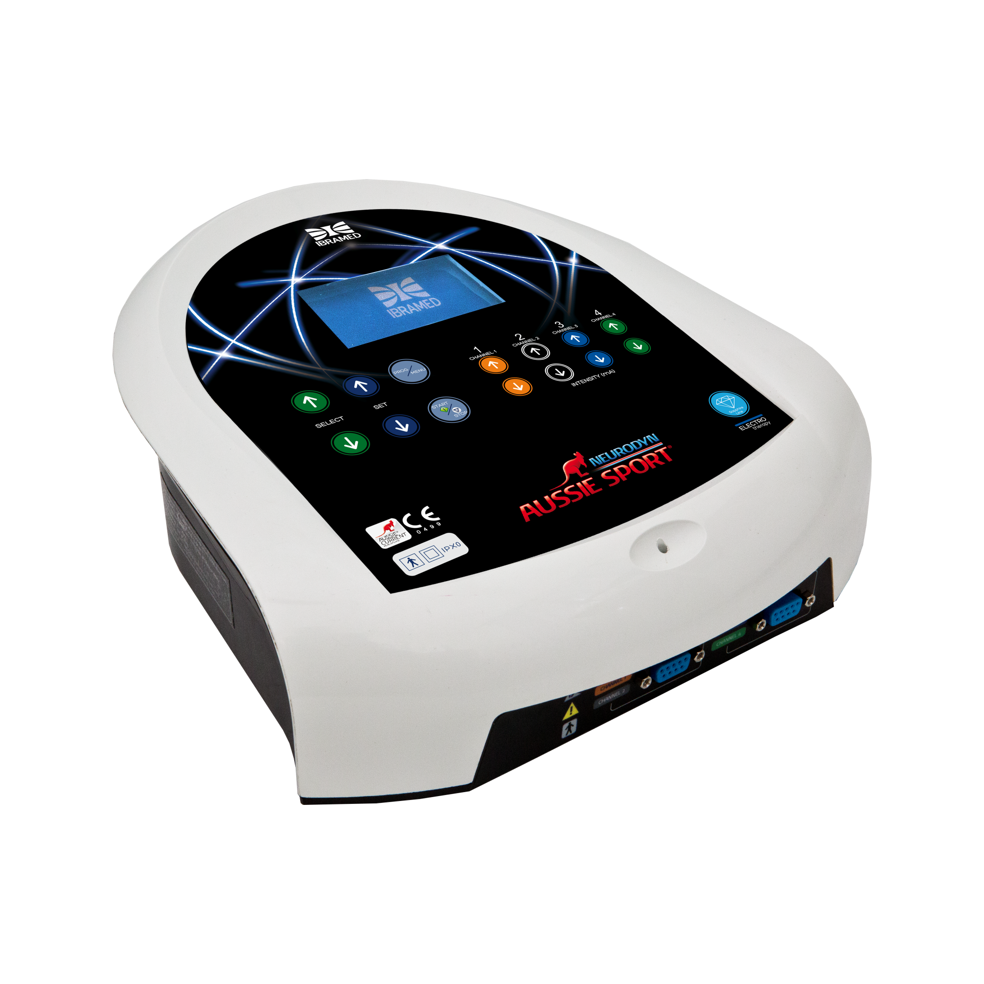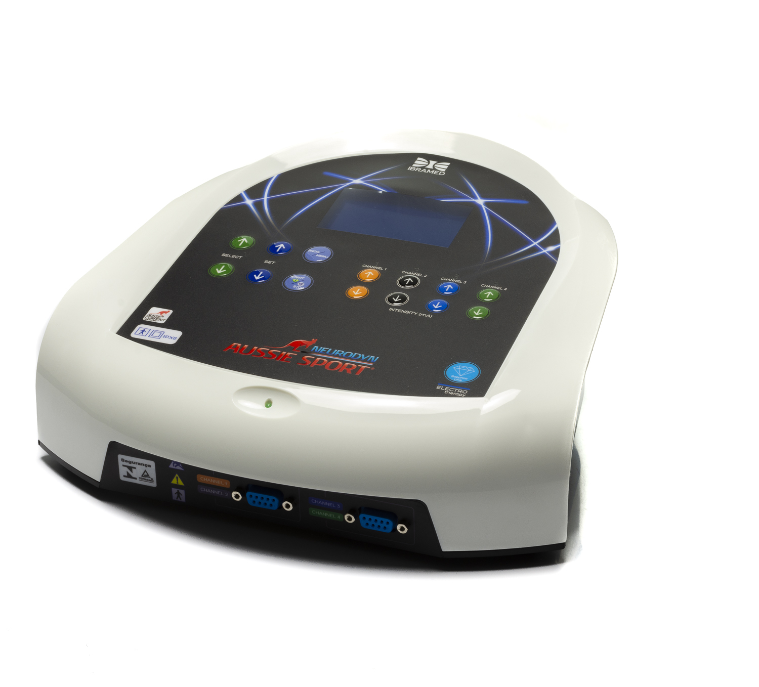 O Neurodyn Aussie Sport é um equipamento para aplicação da exclusiva corrente Aussie (também chamada corrente australiana), uma nova geração de corrente elétrica para estimulação com vantagens sobre os tradicionais métodos de estimulação. A corrente Aussie possui duas possibilidades de frequência: 1KHz e 4KHz, o que permite seleção de acordo com o objetivo terapêutico, sendo 1KHz para estimulação motora (fortalecimento e tonificação muscular) e 4KHz para estimulação sensorial (drenagem e analgesia). A corrente apresenta burst de curta duração (2ms na corrente de 1KHz e 4ms na corrente de 4KHz), de frequência variável de 1 a 120Hz e intensidade de 1 a 180mA. O Neurodyn Aussie Sport apresenta quatro canais de saída com controles independentes de intensidade, 10 protocolos de tratamento pré-programados e 20 protocolos particulares, display LCD Blue Light maior, teclas soft touch, disposição dos parâmetros de forma diferenciada e exclusiva bolsa para transporte. O equipamento deve ser usado somente sob prescrição e supervisão de um profissional licenciado.